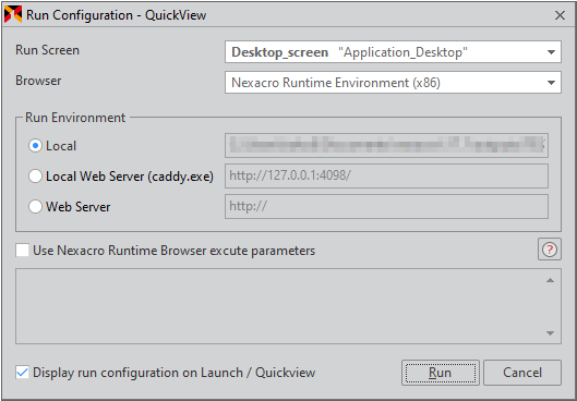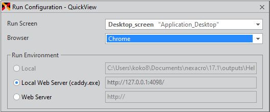 웹브라우저를 선택하면 Run Enviroment 항목이 Local Web Server로 변경됩니다. [Run] 버튼을 클릭합니다.