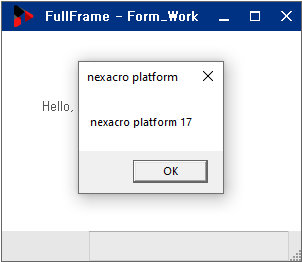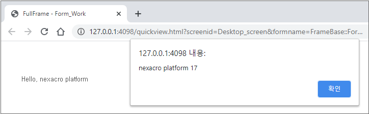 this.alert("nexacro platform 17");메뉴 [Generate > Quick View]를 선택하고 설정창에서 [Run] 버튼을 클릭해 앱을 실행하고 "Hello, nexacro platform"라는 텍스트 영역을 클릭하면 아래와 같이 경고창이 표시됩니다.