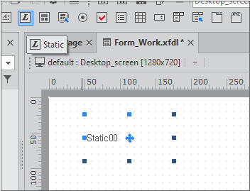 nexacro platformアプリで文字を表示するときは、Staticコンポーネントを使用します。'Objects'ツールバーで、Staticコンポーネントをマウスで選択し、Form Designウィンドウで任意の場所をマウスでクリックすると、デフォルト値として設定されているサイズのStaticコンポーネントが配置されます。