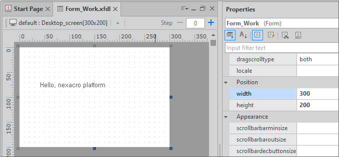 디자인 화면에서 Static 컴포넌트를 제외한 영역을 클릭하면 Form이 선택됩니다. 속성창에서 width, height 속성값을 300, 200으로 수정하고 저장합니다.
