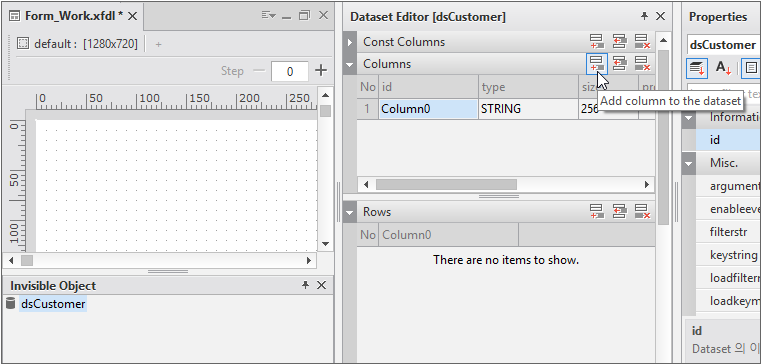 nexacro studioツールバーでデータセットを選択した状態で、デザイン領域任意の場所をクリックすると、データセットが追加されます。データセットは、画面に表示されるコンポーネントではなく、内部でデータを管理するために使用されるコンポーネントであるため、Invisible Objects項目に管理されます。