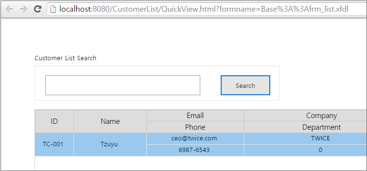 指定されたWebブラウザが実行されながら、実行されたnexacro platformアプリを確認することができます。 Searchボタンをクリックすると、スクリプトで追加したデータがグリッドに表示されます。