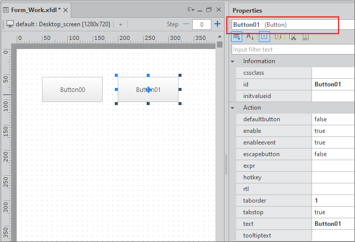 넥사크로 스튜디오에서 "Properties"라고 표시된 속성창에 "Button01"이 표시되는 것을 확인합니다.