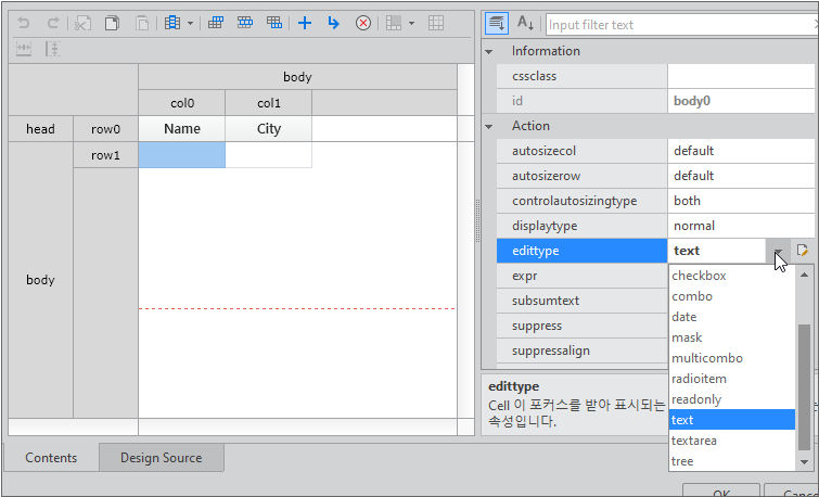 Grid Contents Editor 속성창에서 editype 속성 항목을 찾고 속성값을 "text"로 변경합니다.