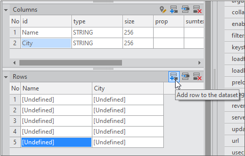 Dataset Editor의 Rows 툴바에서 "+" 모양의 아이콘(Add row to the dataset)을 5번 클릭합니다.
