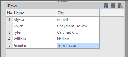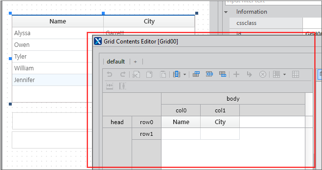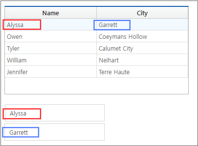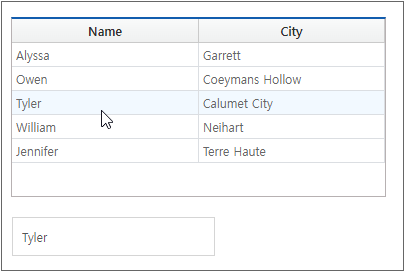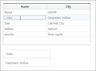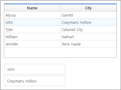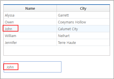 Grid 컴포넌트에 첫 번째 Row가 선택된 상태이고 Edit 컴포넌트에 첫 번째 Row의 Name, City 데이터가 표시되는지 확인합니다.