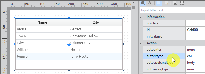 Grid 컴포넌트를 선택하고 속성창에서 autofittype 속성값을 "col"로 변경합니다.
