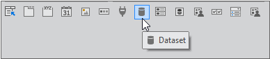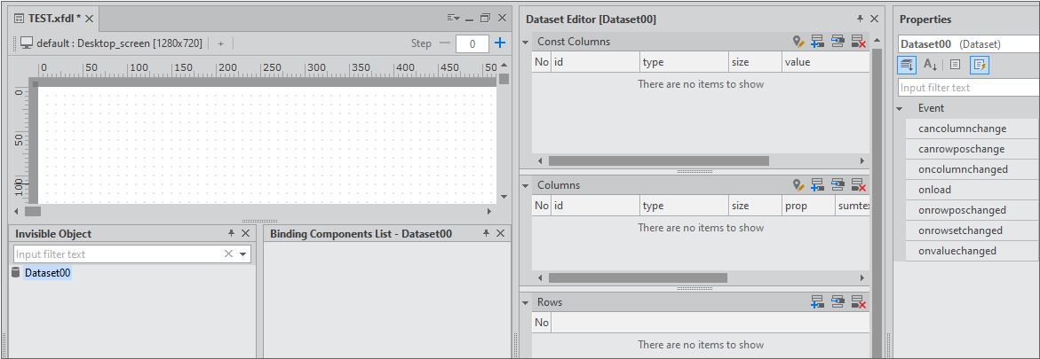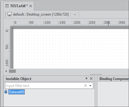 Button 컴포넌트와 다르게 Dataset 오브젝트는 화면에 표시되지 않습니다. Dataset 오브젝트는 데이터를 관리하는 보이지 않는 형태이기 때문입니다. 이런 오브젝트는 Invisible Object 창에 따로 표시합니다.