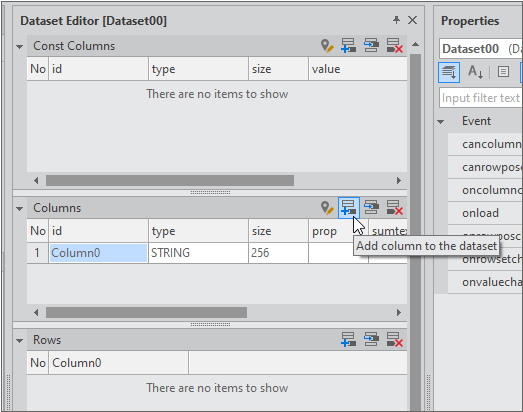 Dataset Editor의 Columns 툴바에서 "+" 모양의 아이콘(Add column to the dataset)을 클릭합니다.