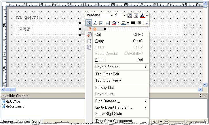 Clicking search button creates script to generate new data at Dataset. First, click search button and select “onclick” among the event list in “Properties” window. Register functions to bind.