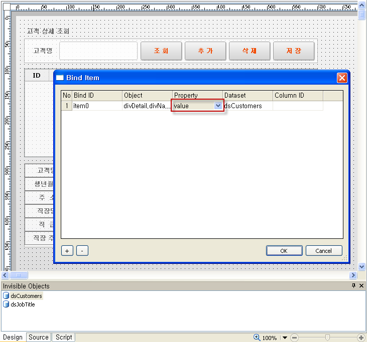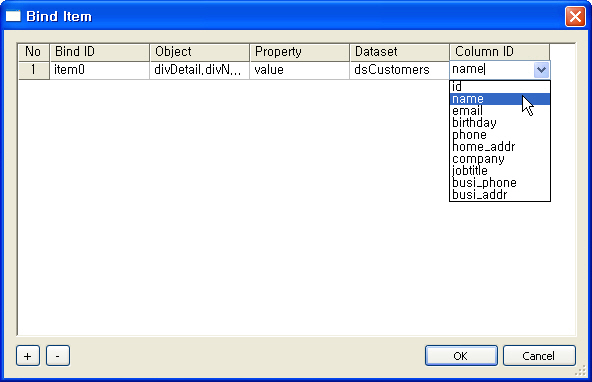 Compnent drawn above Division(Div) is identified by having the name of division(Div). By dragging Dataset and enter it into compnent to be bound, “Bind Item” window is opened.