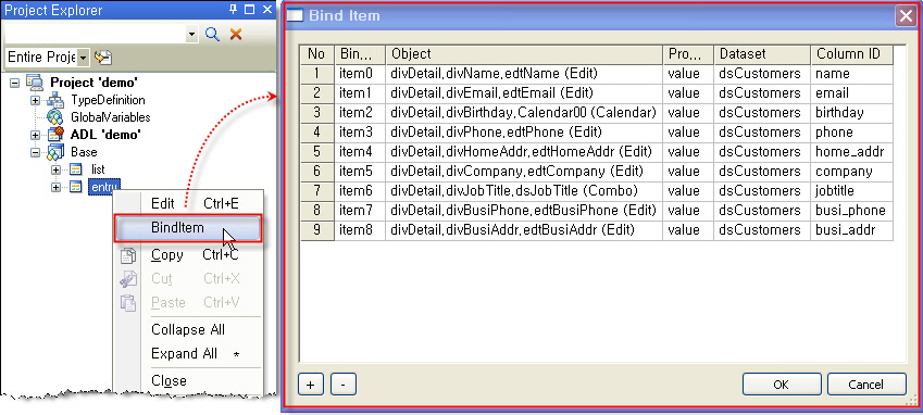 “Bind Item” window can be confirmed at pop-up menu which is appeared by clicking the right button of mouse after finding the name of forms to work in “Project Explore” window.