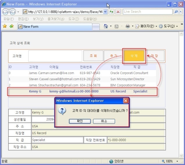 If selecting data to delete from Grid, detailed data are shown up. By double-clicking “Delete” button, clean data from the form.