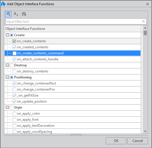속성창에서는 한 번에 하나의 오브젝트 인터페이스 함수만 추가할 수 있지만 [Add Object Interface Functions] 창에서는 여러 항목을 선택하고 추가할 수 있습니다. 추가할 오브젝트 인터페이스 함수를 선택하고 [OK] 버튼을 클릭합니다.