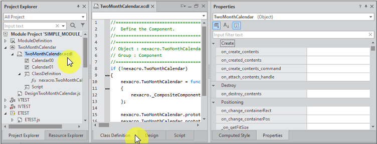 Project Explorer 탭에서 .xcdl 파일(Composite Component) 또는 [Object 명].js 파일을 속성창에서 오브젝트 인터페이스 목록을 확인할 수 있습니다. 넥사크로 스튜디오에서 이벤트를 추가하는 방식과 마찬가지로 각 항목을 더블클릭하면 기본 템플릿이 생성됩니다.