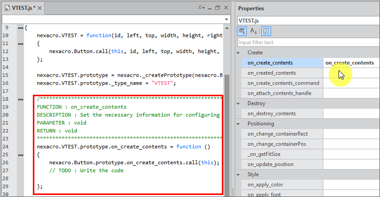 넥사크로 스튜디오에서 이벤트를 추가하는 방식과 마찬가지로 각 항목을 더블클릭하면 기본 템플릿이 생성됩니다. 인터페이스 함수에 대한 간단한 설명과 작성해야 할 코드 설명을 주석 형식으로 제공합니다.
