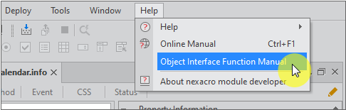 메뉴 [Help > Object Interface Function Manual] 항목을 선택하면 설치 폴더에서 JSDoc 파일(index.html)을 웹브라우저에서 불러옵니다.