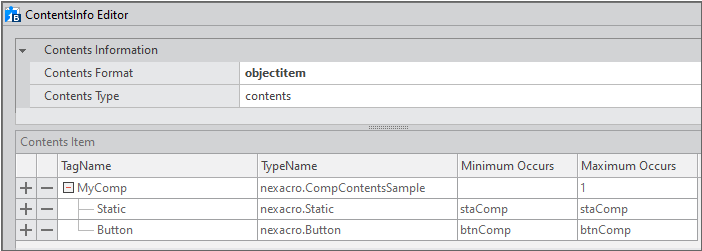 넥사크로 스튜디오에서 contents 속성 설정 시 각 하위 아이템은 하나씩 추가할 수 있으며 id 값은 "staComp", "btnComp"로 설정됩니다.