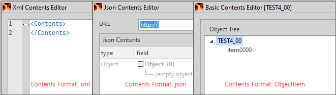 contents 속성을 설정하면 기본 제공되는 3가지 형태의 Content Editor를 오브젝트 속성 설정 시 사용할 수 있습니다.