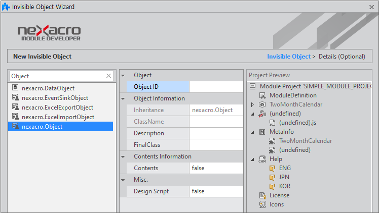 생성할 오브젝트 타입을 선택하고 항목을 입력한 후 [Finish] 버튼을 클릭하면 오브젝트를 생성합니다. 오브젝트의 메타인포 상세 항목을 설정하고 싶다면 [Next] 버튼을 클릭해 상세 항목을 설정할 수 있습니다.