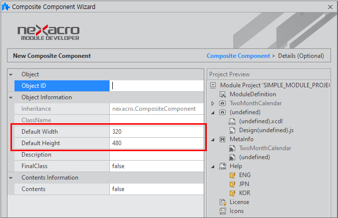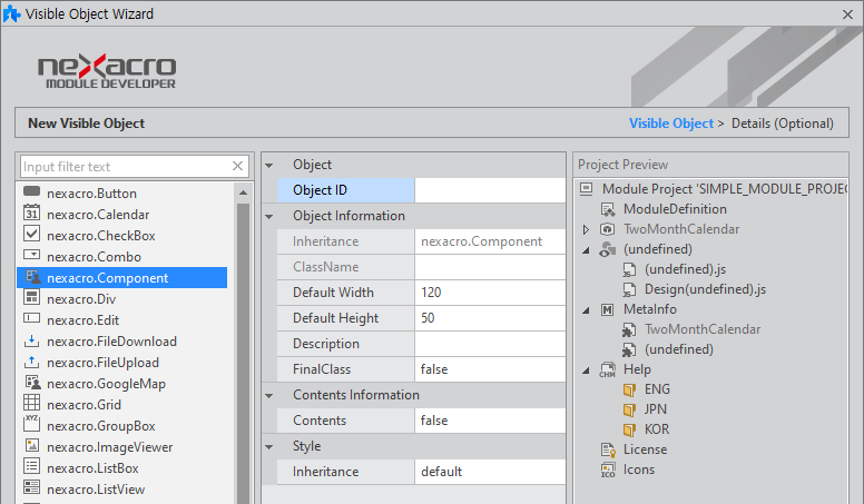 Composite Component는 nexacro.CompositeComponent로 고정되어 있고 나머지 오브젝트는 왼쪽 목록에서 상속받을 오브젝트를 선택합니다.