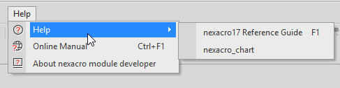Help | 도움말 창을 표시합니다. Chart 컴포넌트처럼 추가 모듈을 설치한 경우 추가된 모듈 도움말을 선택할 수 있습니다. |