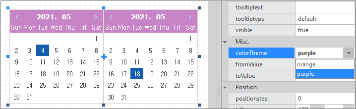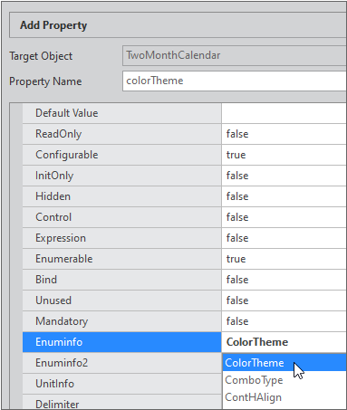 Add a property that can change the style of the Calendar component. The name of the property is colorTheme. Before adding the property, EnumInfo must be added first.