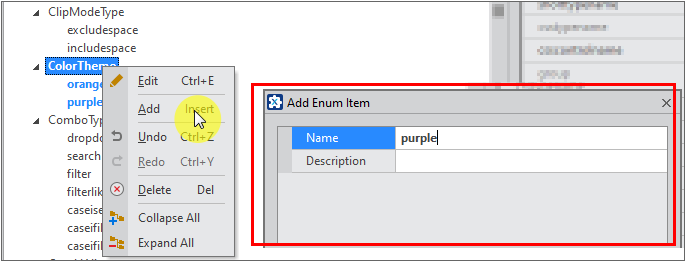Select the added Enum item, select the [Add] item from the context menu, and then add the "orange" and "purple" items in the [Add Enum Item] window.