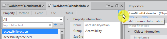 Detailed items can be set in the wizard that adds properties, methods, and events. This is called the metainfo. You can edit the detailed items by selecting the Property, Method, or Event items of the object under the MetaInfo file in Project Explorer and double-clicking it.