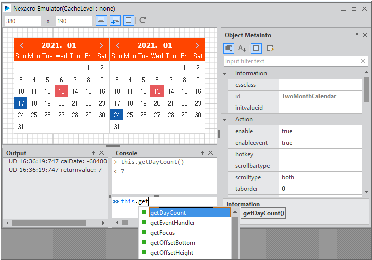 Run the emulator, select the dates from the first and second Calendar components, call the added method in the console window, and check the returned value.