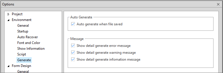1 | Auto Generate | Determines whether to conduct generation automatically when you save a file |