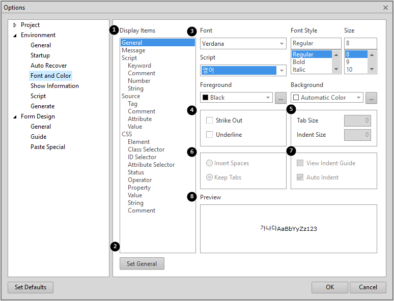 2 | Set General | The value set as the 'General' item value in Display Items is reflected in the rest of the Display Items. It can be used when you want to set the basic Font, Color style and directly modify the rest of the Display Items. For example, if you change the Size value of the 'General' item to 9 and click the 'Set General' button, the Size values of all other items are changed to 9. |