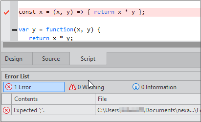 If you select "ECMAScript 5" as the Version option and use ES6 syntax in the script edit window, then it will be processed as a script error, and Generate will not be processed normally.