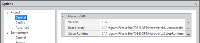 Nexacro SDK | Select the SDK version to use for the project. You can choose among the SDK versions installed in the SDK folder. - Base Library: Displays the Base Library folder corresponding to the selected SDK. - Setup Runtime: Displays the Setup Runtime folder corresponding to the selected SDK. |