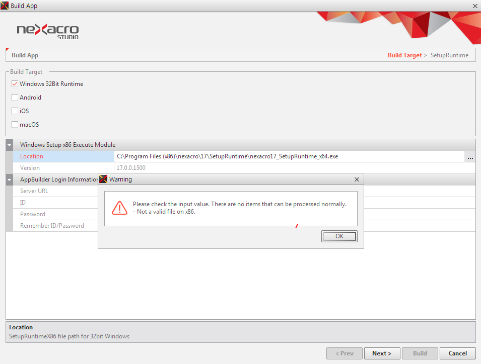 nexacrostudio에서 BuildApp시 Build Target과 일치하지 않는 모듈(x86/x64/XP)을 사용할 경우 에러메세지 창을 띄워주는 기능을 추가했습니다. (RP. 79284)
