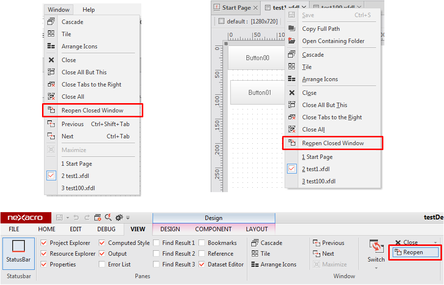 • 현재 활성화 된 View의 우측 View를 모두 닫을 수 있는 기능을 추가했습니다. >> 해당 기능은 "nexacrostudio 메뉴의 [Windows] - [Close Tabs to the Right]", "nexacrostudio 리본 메뉴의 "[Close] > Close Tabs to the Right", "편집기 화면의 팝업 메뉴"에서 사용할 수 있습니다. • 최근에 닫은 창을 다시 열 수 있는 기능을 추가했습니다. >> 해당 기능은 "nexacrostudio 메뉴의 [Windows] - [Close Tabs to the Right]", "nexacrostudio 리본 메뉴의 "[Close] > Close Tabs to the Right", "편집기 화면의 팝업 메뉴"에서 사용할 수 있습니다. >> 창을 닫은 기록이 없을 경우에는 메뉴가 비활성화됩니다. • |