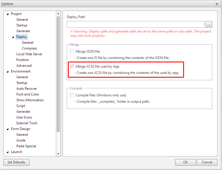 • nexacrostudio에서 packing시 ADL에서 사용 중인 복수개의 xcss를 하나의 xcss 파일로 통합하는 기능을 추가했습니다. >> 해당 기능은 "nexacrostudio 메뉴의 [Option] - [Proejct] - [Deploy] - [Merge] - [Merge XCSS file used by App]" 옵션을 체크하면 사용할 수 있습니다. |