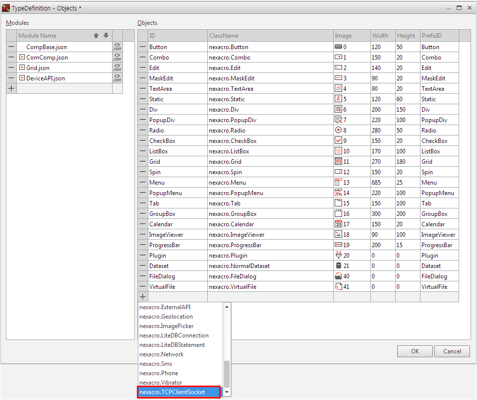 • TCP 통신을 사용하여 서버에 연결하여 정보를 송수신할 수 있는 컴퍼넌트입니다. • TCPClientSocket은 Windows nexacro Browser 환경에서만 사용할수 있습니다. • nexacro14 대비 일부 속성명을 변경하였습니다. (errno -> errorcode / errmsg -> errormsg) • nexacro14의 "onclose/onconnect/onsend" 이벤트를 onsuccess 이벤트로 통합했니다. (ondataarrived, onerror 이벤트는 유지) • onsuccess 이벤트의 SocketEventInfo 속성에 이벤트 발생 원인과 정보를 전달합니다. • nexacrostudio에서 TCPClientSocket은 아래와 같이 추가 후 사용합니다. |