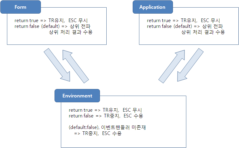 • onerror 이벤트는 "Form -> Environment / Application -> Environment"로 전파합니다. • "Form -> Application"으로는 onerror 이벤트를 전파하지 않습니다. • 이벤트에서 "false"를 리턴할 경우 이벤트를 전파하며, Transaction도 중지합니다. • 이벤트에서 "true"를 리턴할 경우 이벤트를 전파하지 않으며, Transaction도 유지합니다. • 아래의 그림을 참고하면 onerror 이벤트 전파 규칙을 쉽게 이해 할 수 있습니다. |