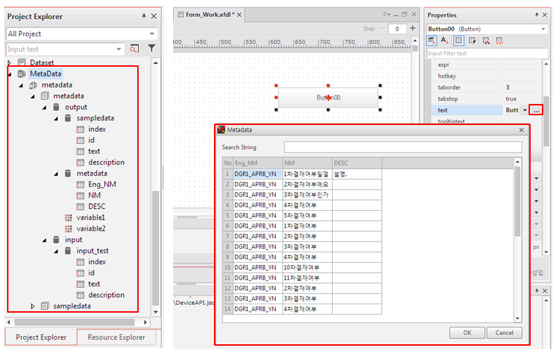 • MetaData 기능은 아래의 조건을 모두 충족하여야 활성화됩니다. >> "TypeDefinition - Services" 영역에 "metadata" type의 서비스가 정의되어야 합니다. >> "Project Explorer"에 MetaData 서비스의 ModelInfo가 로드되어야 합니다. >> "Tools - Options" 메뉴의 Option 창에서 "Project - advanced" 항목의 "Use user-defiend metadata" 옵션이 체크되어 있어야합니다. • 컴퍼넌트의 id와 text 속성에 MetaData Dialog를 open할 수 있는 버튼을 제공합니다. • MetaData Dialog에서 선택한 값이 id 또는 text 속성값으로 설정됩니다. |