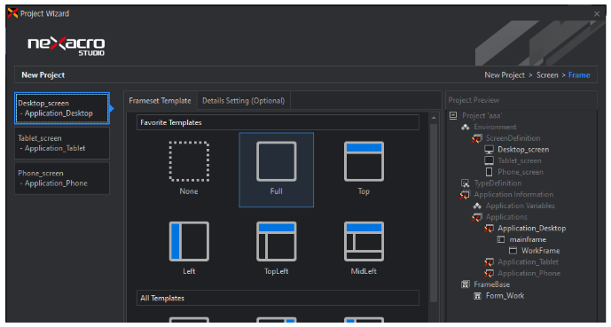 넥사크로스튜디오의 "Project Wizard"에서 미리 설정된 템플릿의 프로젝트를 생성할 수 있는 "프로젝트 템플릿" 기능을 추가했습니다. (RP.87013)