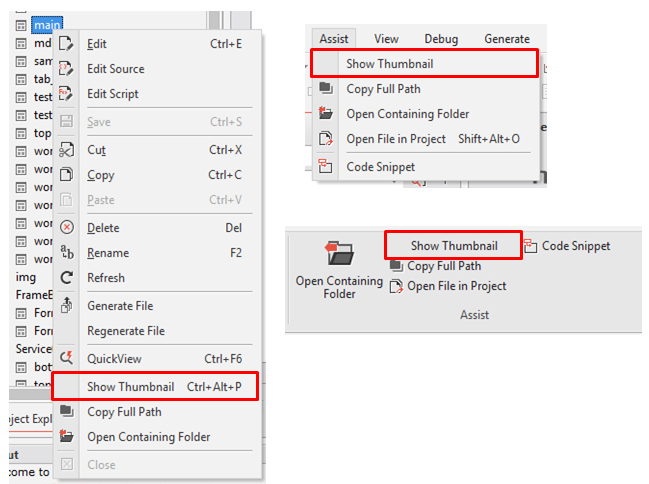 • "Project Explorer/Resource Explorer"에서 관리하는 폼 또는 이미지에 대한 섬네일 이미지를 표시해주는 기능을 추가했습니다. • "Project Explorer/Resource Explorer" 트리의 폼 또는 이미지 선택 후 [우클릭] - [Show Thumbnail] 클릭 시 섬네일 이미지를 확인 할 수 있습니다. |