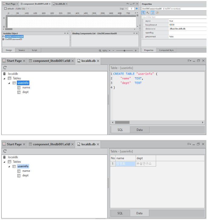 • 넥사크로스튜디오에서 LiteDBConnection의 datasource 속성값이 지정된 DB 파일 오픈이 가능합니다. • 넥사크로스튜디오에서 LiteDBStatement.ldbconnection 속성값에 지정한 ListeDBConnection 오브젝트에 연결된 DB에 대한 퀴리 에디터를 제공합니다. |