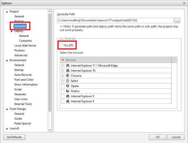 • RTL 기능이 적용된 코드를 Generate 하려면 NexacroStudio 의 옵션값을 설정하여야 합니다.(하단 이미지 참고)