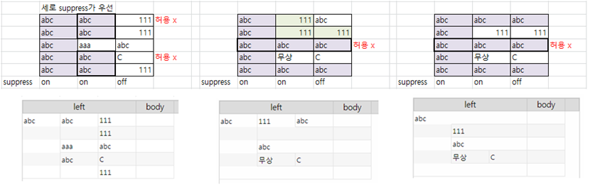 • spresshorzcell 프로퍼티의 설정값은 "none / left/ right / leftright" 4가지 입니다. • spresshorzcell 프로퍼티는 Body Band이면서 Left/Right Band인 Cell을 대상으로 적용됩니다. • Cell에 suppress 프로퍼티가 설정되어 있고, 실제로 데이터가 suppress되어 있을 경우는 suppresshorzcell 프로퍼티가 적용되지 않습니다. • Cell에 suppress 프로퍼티가 설정되어 있을 경우 아래와 같은 예외사항이 적용됩니다. |