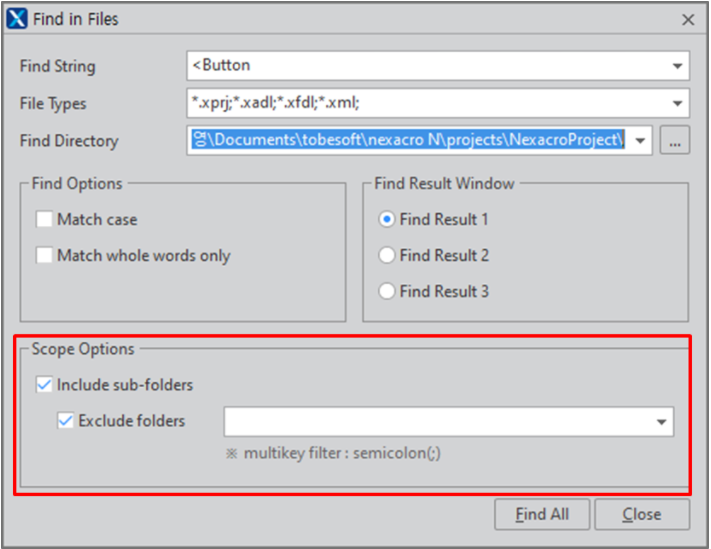 1. Nexacro Studio의 파일 내 검색(Find in Files) 기능에 제외 디렉토리를 지정하는 옵션을 추가했습니다. (RP 93947)