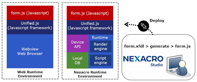 넥사크로는 독자 개발한 실행환경을 사용합니다. 최적의 실행 속도를 확보할 수 있으며 실행 환경에 따른 차이를 개발자가 고민하지 않고 개발 플랫폼 자체적으로 대응할 수 있습니다. 또한, 다른 프로그래밍 언어를 따로 배우지 않고 자바스크립트만 사용해서 화면을 구성하고 디바이스 API를 제어하고 비즈니스 로직을 개발할 수 있습니다. 넥사크로에서 제공하지 않는 특정 데이터 형식이나 장비, IoT 기기 연동은 서드파티를 통해 모듈 또는 어댑터 형태로 개발할 수 있으며 프로젝트에서 모듈을 설치하는 간단한 동작만으로 기능을 확장할 수 있습니다.