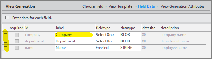 넥사크로 스튜디오 View Generation Wizard 실행 시 Field Data 단계에서 필드 순서를 조정할 수 있고 label 컬럼값을 수정할 수 있게 변경했습니다. (RP 92835)