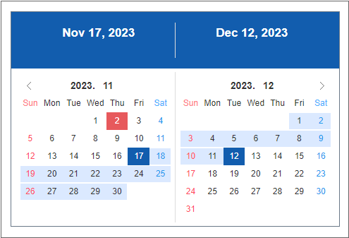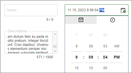 Start, end date, and time selection component