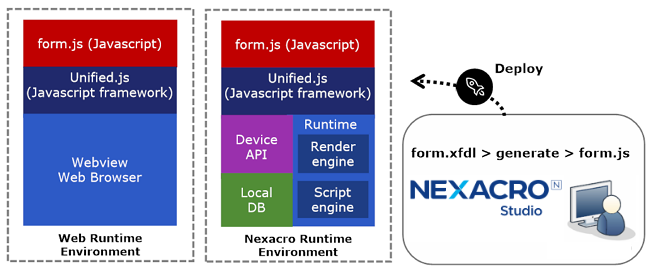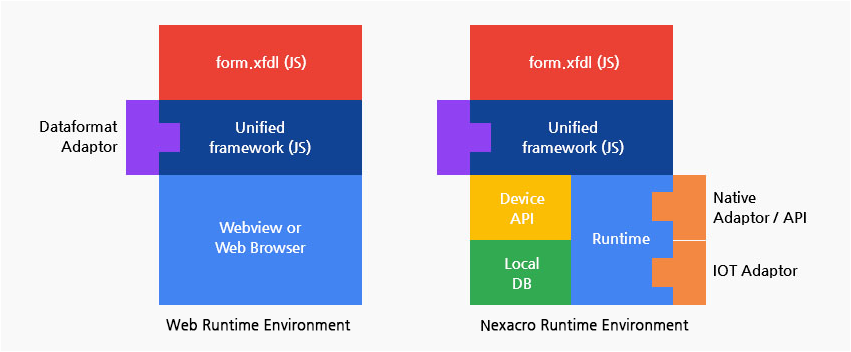 실행환경(Runtime Environment): 모바일 앱, 데스크톱 앱에서는 오픈소스 기반으로 자체 개발한 렌더 엔진과 스크립트 엔진으로 구성된 넥사크로 실행환경(NRE, nexacro runtime environment)을 사용합니다. 최적화된 실행환경을 제공해 대용량 데이터를 다루거나 복잡한 화면 구성 시 웹브라우저보다 빠르게 처리합니다. 또한, 운영체제에서 지원하는 다양한 API와 장비를 연동할 수 있습니다.